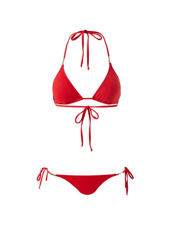 For a shot of instant poolside glamour, look no further than the Cabo Bikini. In a vibrant ‘Red’ hue for the season, this ever-popular halterneck style features triangle cups with removable pads and fastens at the nape of the neck and back. Matching tie-side bottoms mirror the top with sleek, golden trims that complete the look. Style with the June Kaftan for a relaxed, summer-ready finish.
