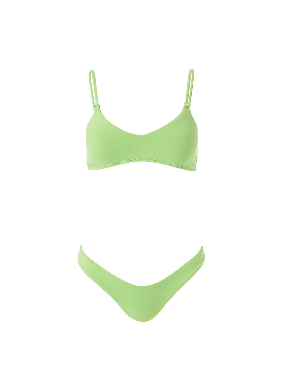 Melissa Odabash’s Vienna Bralette Bikini Top is a playful style, ideal for injecting some fun into your water front wardrobe this season. The 'Lime' Vienna top has removable pads and adjustable strap, the triangular cups meet the thin over the shoulder straps connected by a delicate golden trim, wear paired with the matching high-leg bikini bottoms for an athletic silhouette.